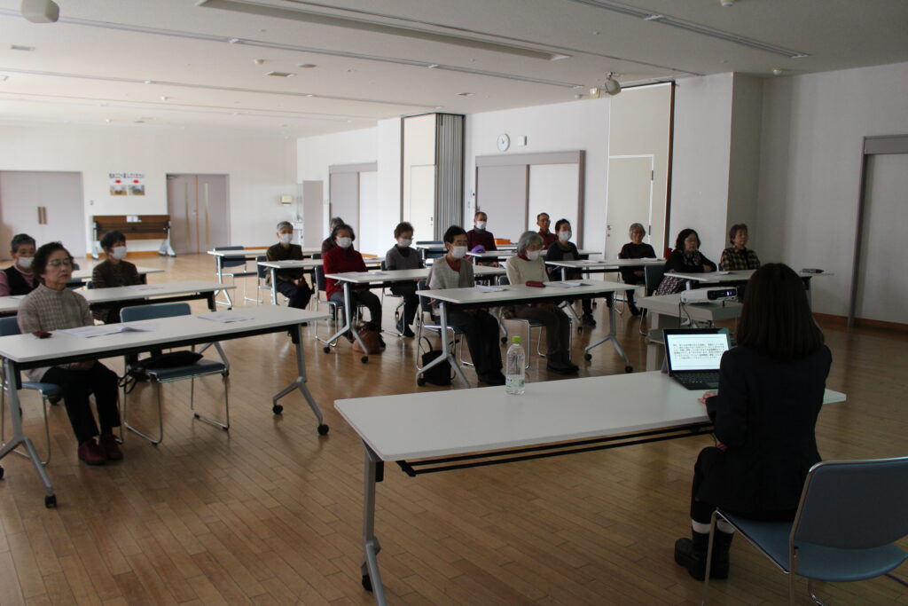 講話では空知信用金庫由仁支店の空知信用金庫地域支援部の越後氏より「特殊詐欺被害防止について」をテーマに講話をいただき、参加者のみなさんは真剣に耳を傾けていました。